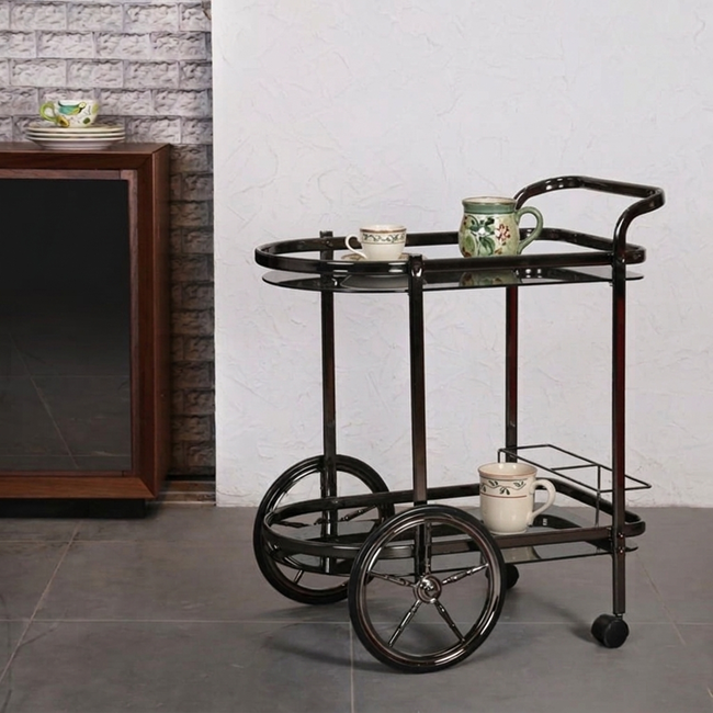 A bar trolley has become an essential piece of home bar furniture in modern Indian homes. Instead of traditional bar cabinets that take up large spaces, a rolling bar cart provides a compact and convenient solution for serving drinks anywhere in your home. With its elegant black finish and premium design, this designer bar trolley enhances the overall look of your living space.