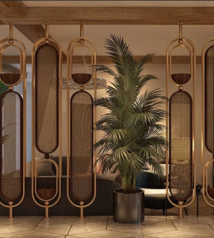 A stylish gold metal room divider designed to create a beautiful partition in living rooms, lounges, or office spaces. Its elegant frame with decorative panels adds a modern luxury touch to any interior while maintaining an open and airy feel.