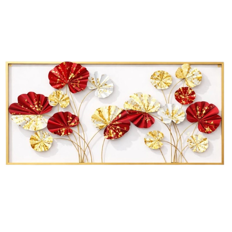 Encased in a sleek golden rectangular frame, the artwork showcases intricately crafted metallic petals with textured gold accents that reflect light beautifully. The combination of bold red hues with white and gold detailing adds warmth, richness, and a premium feel to your décor.