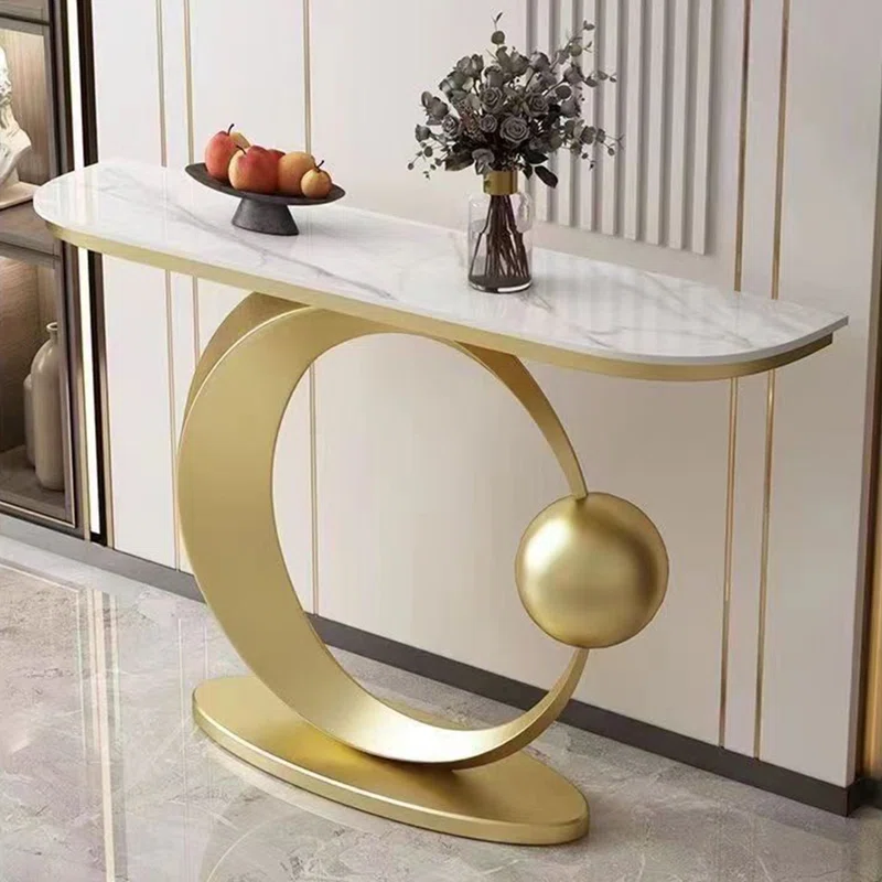 A stylish moon-shaped console table with a golden metal base and marble-look top. Perfect for living room, hallway, or entry area to give a rich and modern look.