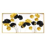 Encased in a sleek rectangular golden frame, the design showcases finely crafted metallic elements with textured gold splashes that reflect light beautifully, adding depth and dimension to your walls. The flowing golden stems connect each element seamlessly, giving the artwork a sense of movement and artistic harmony.